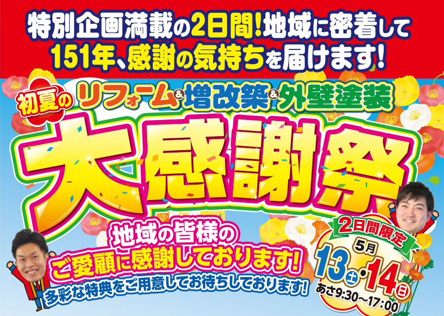 (緑店)リフォーム&増改築&外壁塗装、初夏の大感謝祭を自店舗にて開催!(2023年5月13日〜14日)