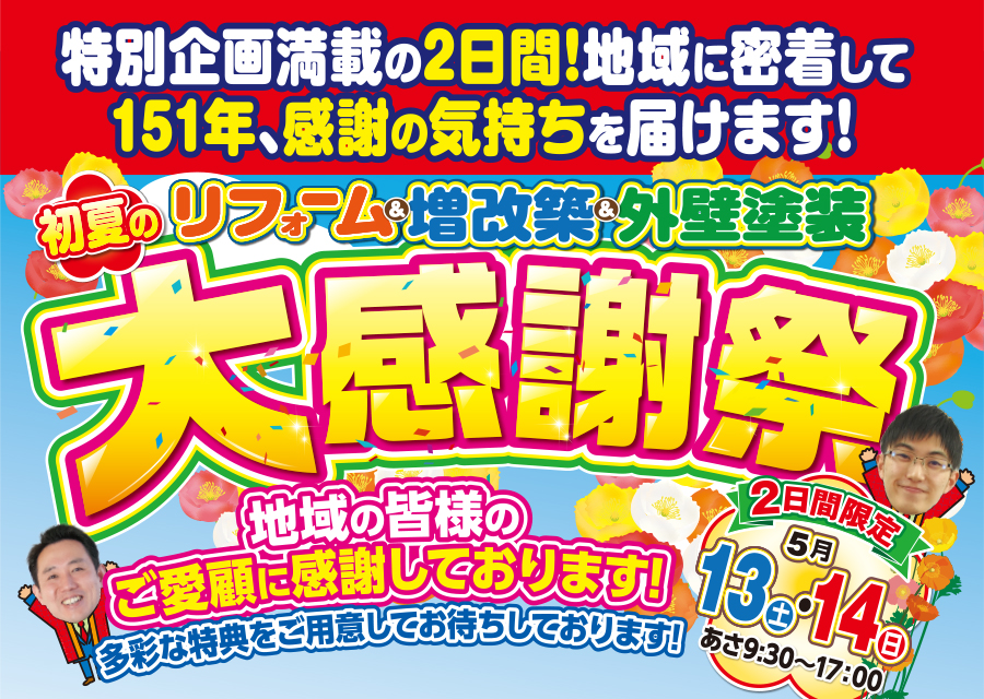 (長久手店)リフォーム&増改築&外壁塗装、初夏の大感謝祭を自店舗にて開催!(2023年5月13日〜14日)