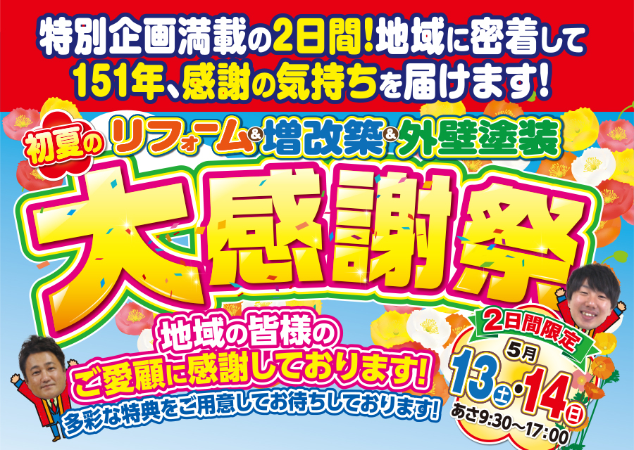 (多治見店)リフォーム&増改築&外壁塗装、初夏の大感謝祭を自店舗にて開催!(2023年5月13日〜14日)