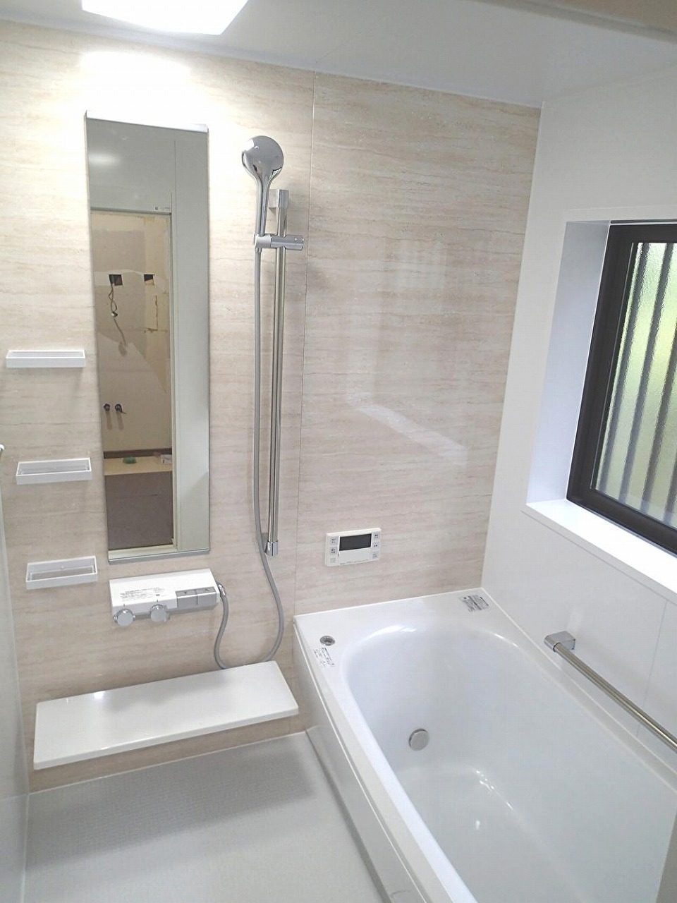 浴室リフォームと同時に窓を一回り小さいペアガラス仕様のサッシへ取替、段差も解消してバリアフリー化しました。