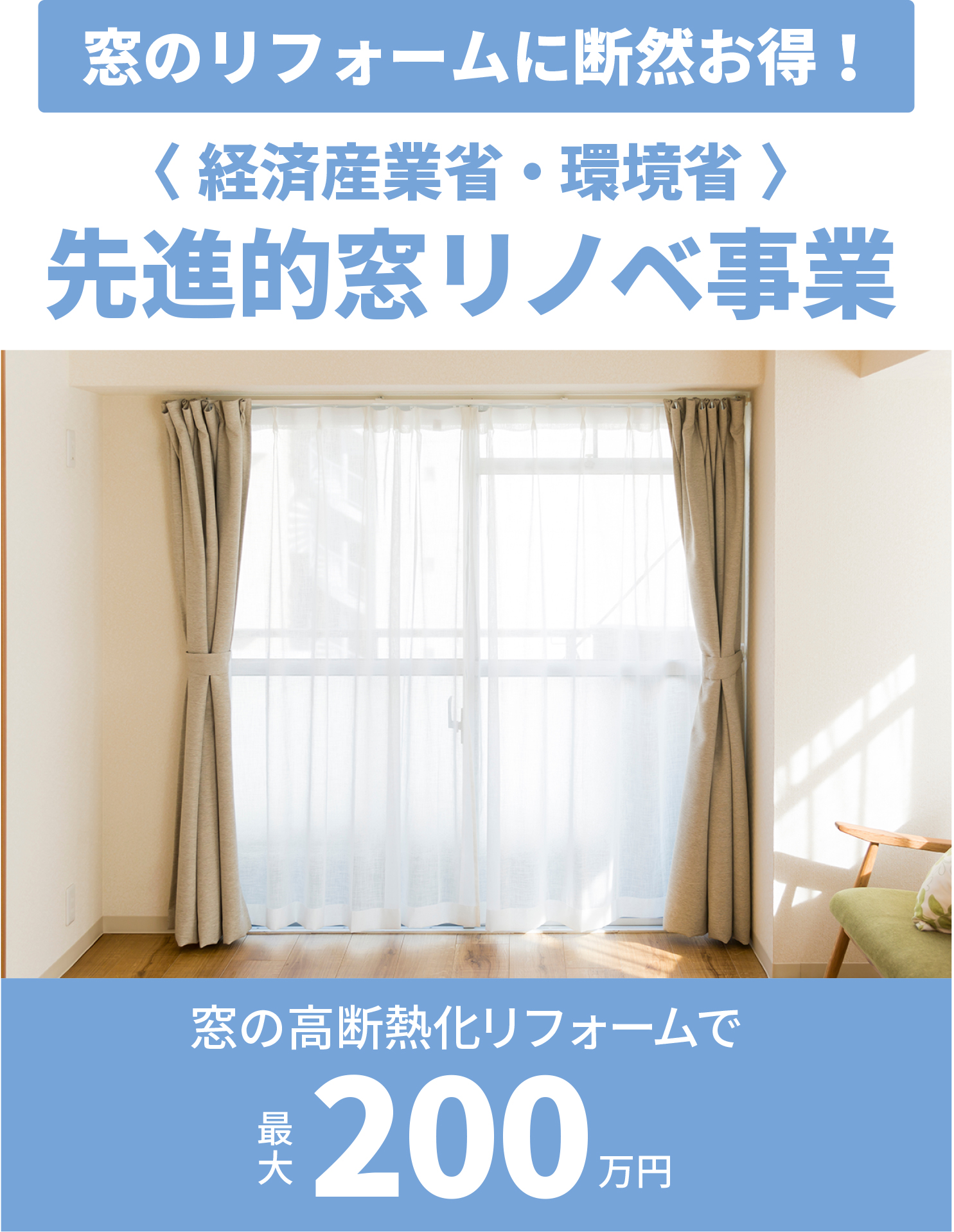 窓の断熱リフォームに特化した補助金。Uw値1.9以下の高断熱窓にすることで、例えば内窓1窓で69,000円(窓面積2.8m2以上の場合)というこれまでにない補助額獲得が可能です。