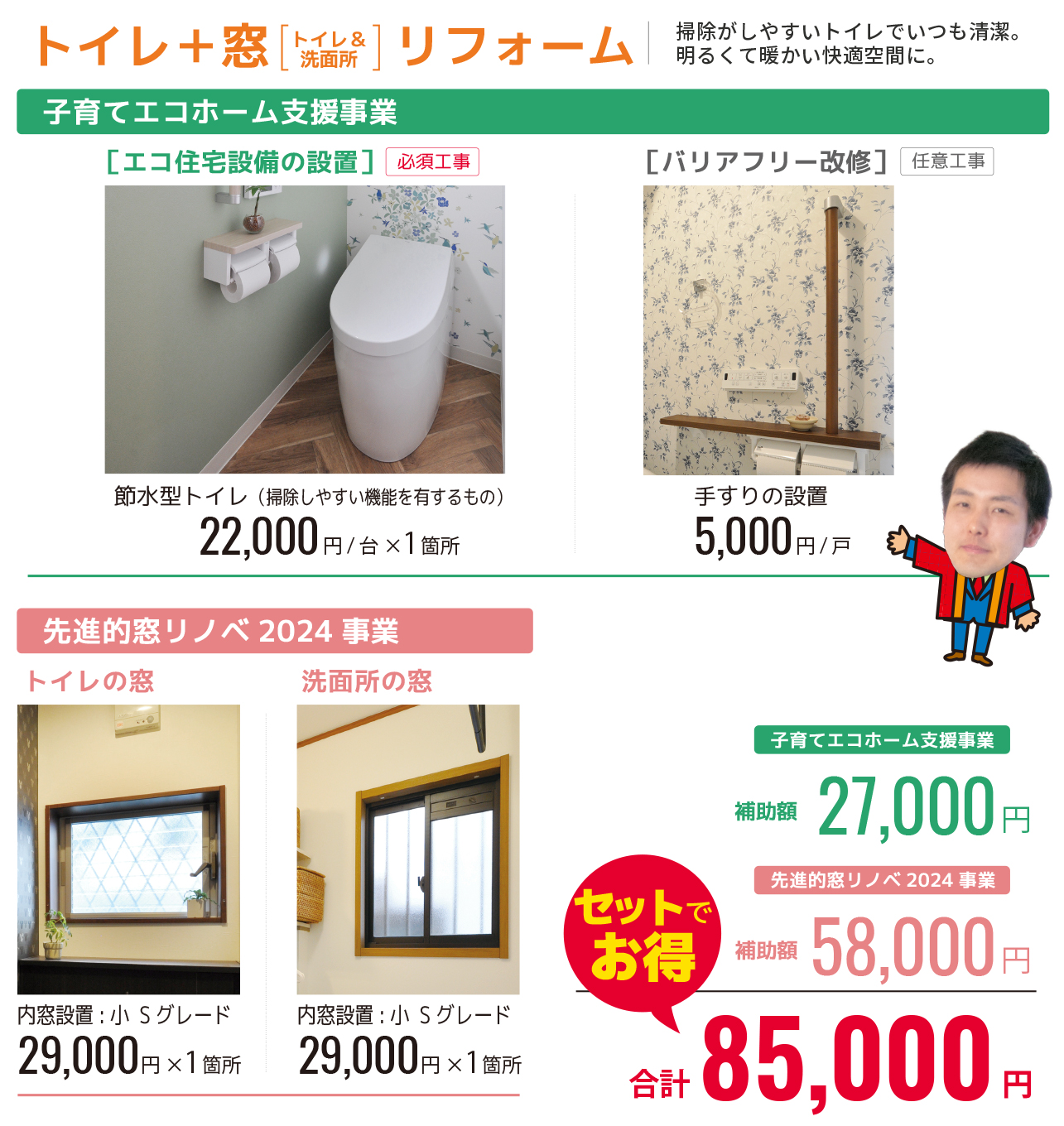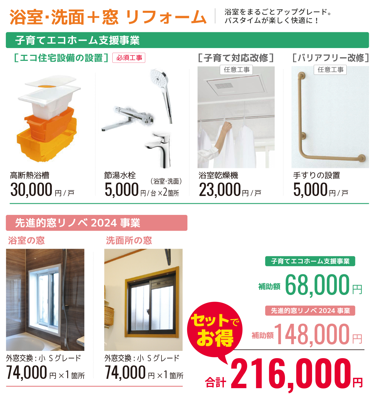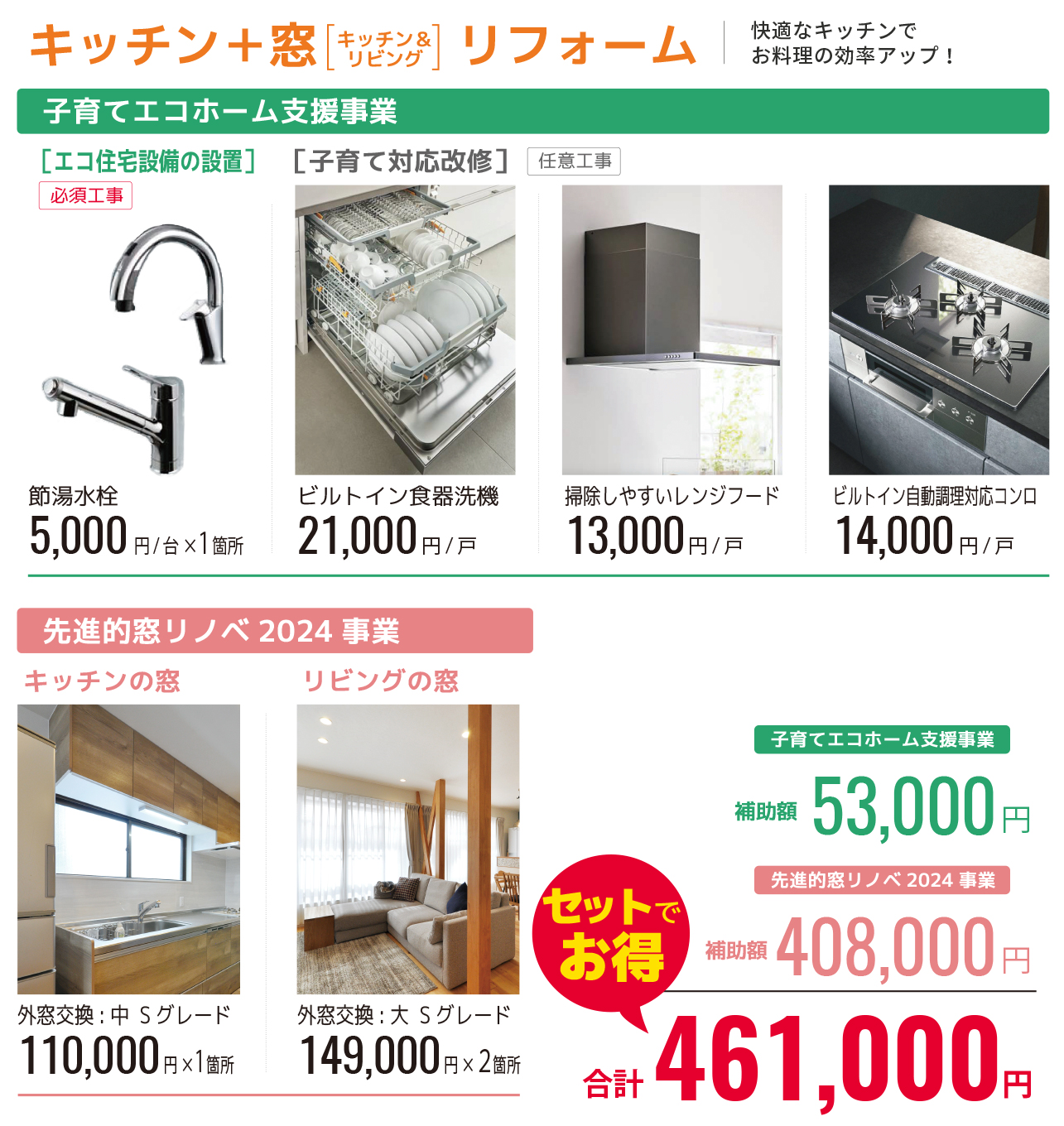 過去最大級の補助金制度で賢くお得にリフォームしませんか?ここでは子育てエコホーム支援事業と先進的窓リノベ2024事業で対象となるリフォームと、具体的に併用した場合にどのくらいの補助金になるかをご紹介しています。キッチン・お風呂・トイレのリフォームをお考えの方は補助金利用でお得にリフォームできるチャンスですので、この機会をぜひご活用ください。