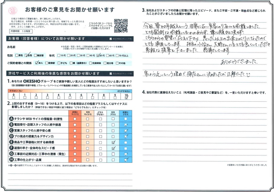 今回築40年越えという非常に古い実家のリフォームを依頼しました。とても面倒な依頼にもかかわらず、嫌な顔ひとつ見せずこちらからの要望に応えてくださり、思った以上の出来上がりになったのでとても満足しています。担当の水谷さん、大野さんにとても良くしていただき素敵な提案をくださいました。感謝しています。