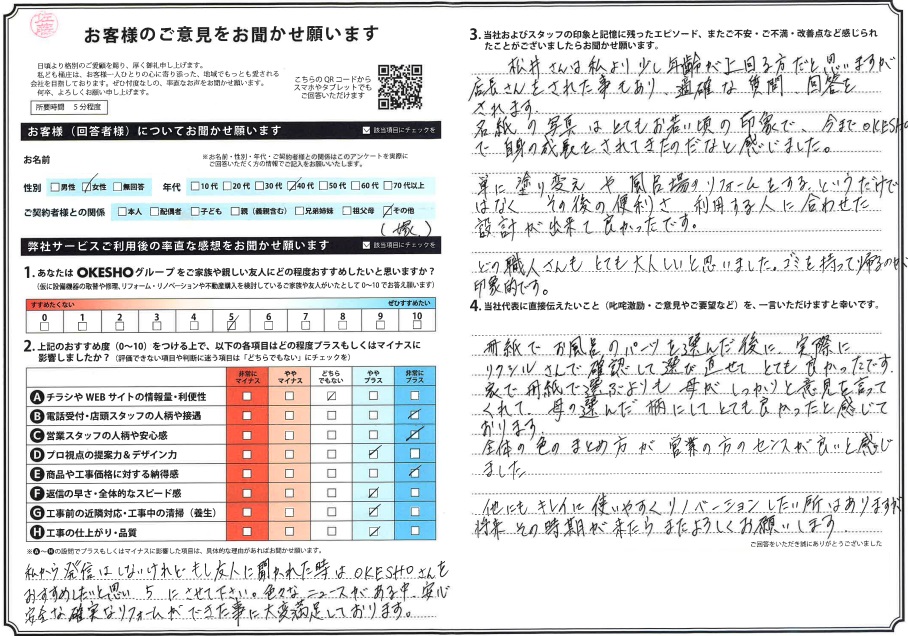 私から発信はしないけれど、もし友人に聞かれた時はOKESHOさんをおすすめしたいと思い5にさせて下さい。色々なニュースがある中、安心安全な確実なリフォームができた事に大変満足しております。