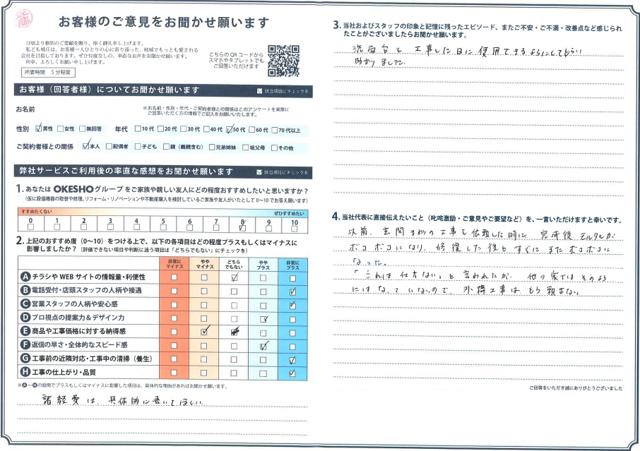 以前、玄関まわりの工事を依頼して時に、完成後モルタルがボコボコになり、修復した後もすぐにまたボコボコになった。