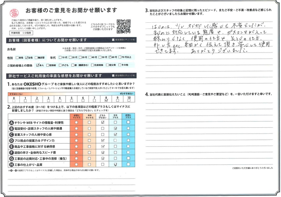 当社およびスタッフの印象と記憶に残ったエピソード、またご不安・ご不満・改善点など感じられたことがございましたらお聞かせ願います。