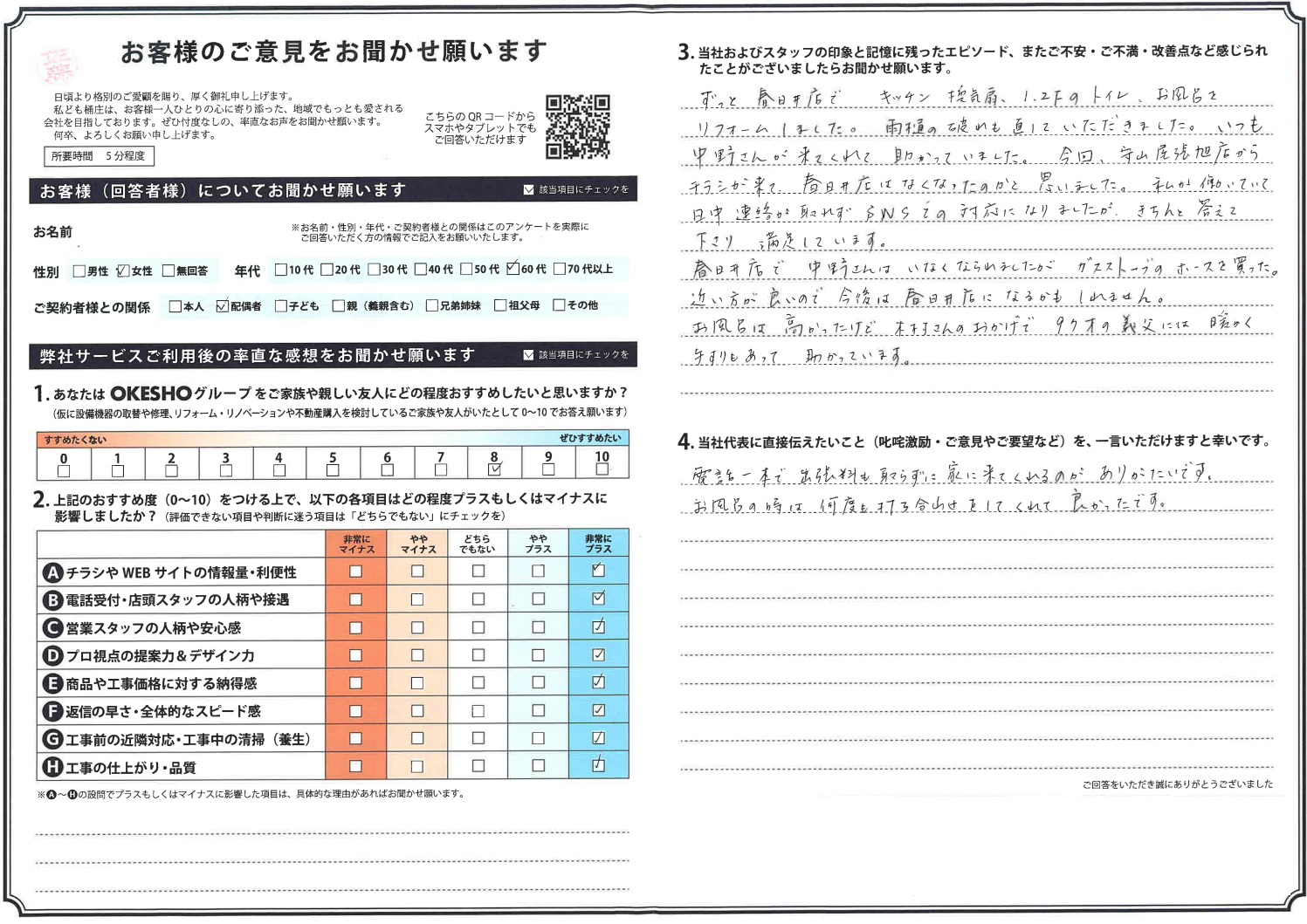 当社およびスタッフの印象と記憶に残ったエピソード、またご不安・ご不満・改善点など感じられたことがございましたらお聞かせ願います。