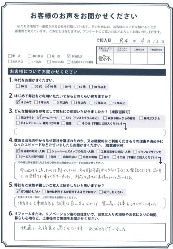 申し込みを送ったのは朝でしたが、その同じ午前中のうちにすぐにお電話くださり、次の日には見積りに来てくださいました。対応の速さが素晴らしいと思いました。
