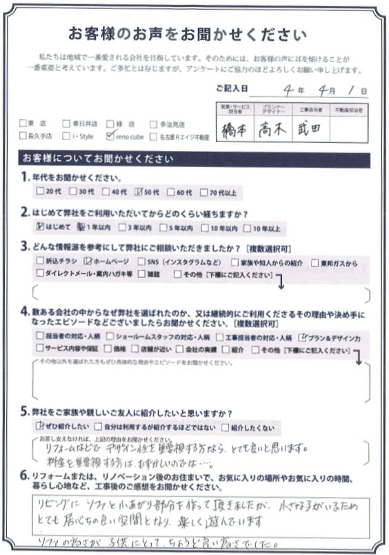 リビングにソファと小あがり部分を作って頂きましたが、小さな子がいるため とても居心ちの良い空間となり、楽しく遊んでいます。