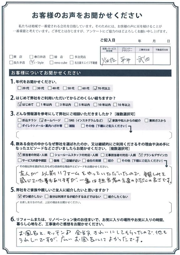 友人が以前リフォームをやっていただいたので、親しみを感じていた事もありますが、一番は担当者の方達の対応の良さです。