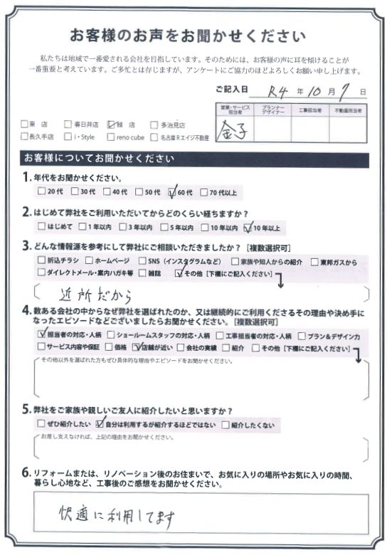 リフォームまたは、リノベーション後のお住まいで、お気に入りの場所やお気に入りの時間、暮らし心地など、工事後のご感想をお聞かせください。