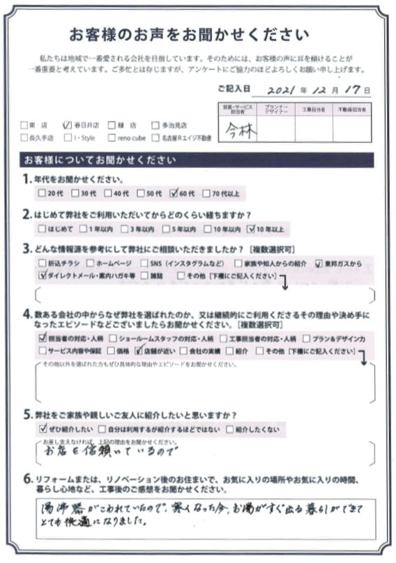湯沸器がこわれていたので、寒くなった今、お湯がすぐ出る暮らしができてとても快適になりました。