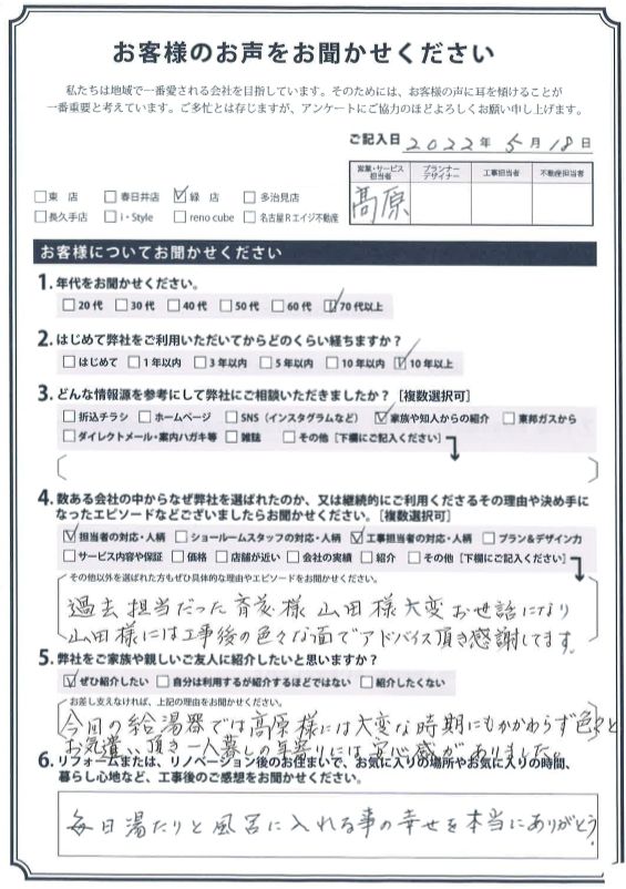 今回の給湯器では髙原様には大変な時期にもかかわらず色々とお気遣い頂き 一人暮しの年寄りには安心感がありました。
