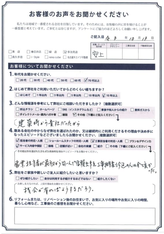 営業担当者が最初から同一人で信頼出来る。工事担当者も今迄の人は全て良かった。