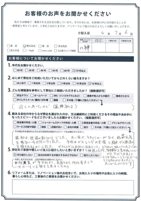 最初は便器の取りかえでした。古い家でウォッシャーがなく、娘の出産を機会に御世話になりました。今回はガスレンジの交換とガス器具の交換をおねがいしました。ガスレンジはあまりに汚れていてどうやってきれいにしたらいいかと相談した所、「ガス管も扱いにくいから掃除します」と、とてもきれいにしていただいて とても助かりましたし、ありがたかったです。
