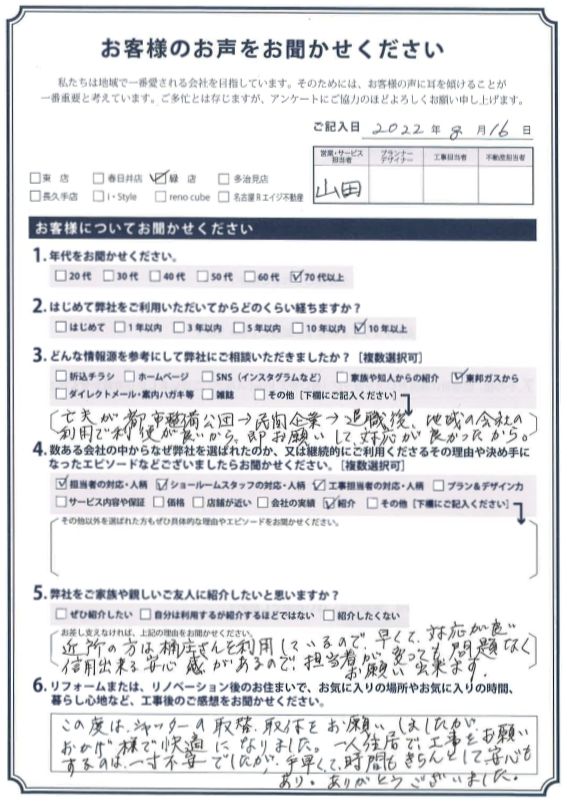 この度はシャッターの取替・取付をお願いしましたが、おかげ様で快適になりました。一人住居で 工事をお願いするのは一寸不安でしたが、手早くて 時間もきちんとして安心もあり。ありがとうございました。