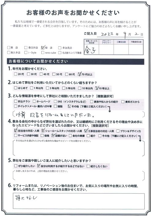 リフォームまたは、リノベーション後のお住まいで、お気に入りの場所やお気に入りの時間、暮らし心地など、工事後のご感想をお聞かせください。