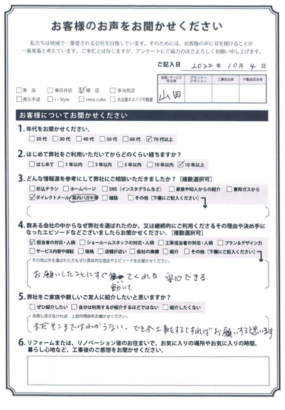 まだそこまではわからない。でも今工事をするとすれば お願いすると思います。