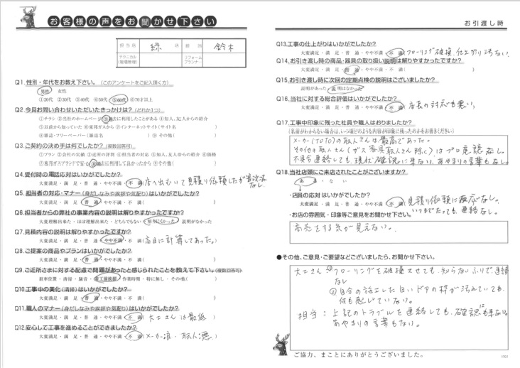 担当:上記のトラブルを連絡しても確認にも来ない。あやまりの言葉もない。