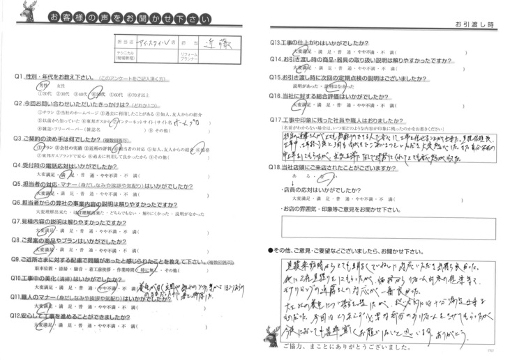 見積訪問時からとても明るく丁寧に対応いただき気持ち良かった。他に2社見積をしてもらったが、価格からリフォーム内容の提案等々モアリビングの近藤さんの対応が一番良かった。