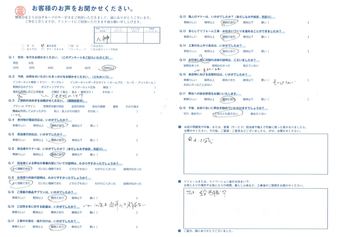 お店の雰囲気や印象。または、営業(サービス)担当者や職人で印象に残った者がおりましたら、お聞かせください。その他、ご要望・ご意見などございましたら、ぜひ、お聞かせください。