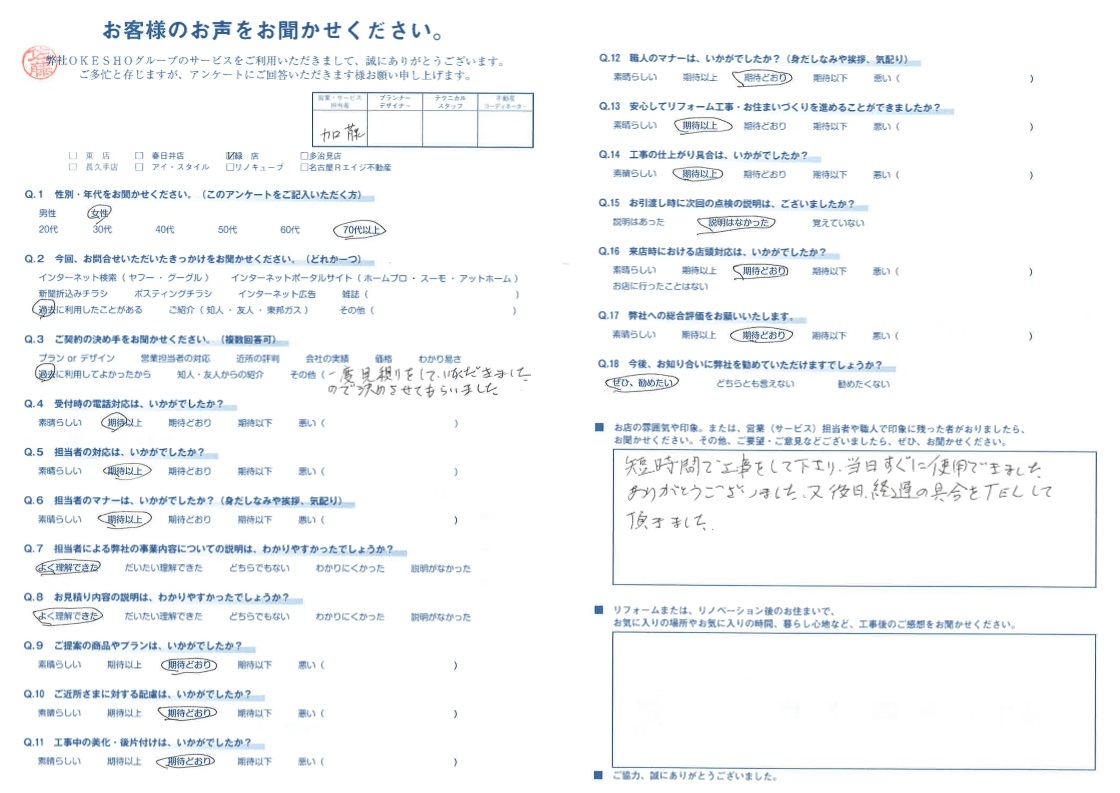 短時間で工事をして下さり、当日すぐに使用できました。ありがとうございました。又、後日 経過の具合をTELして頂きました。
