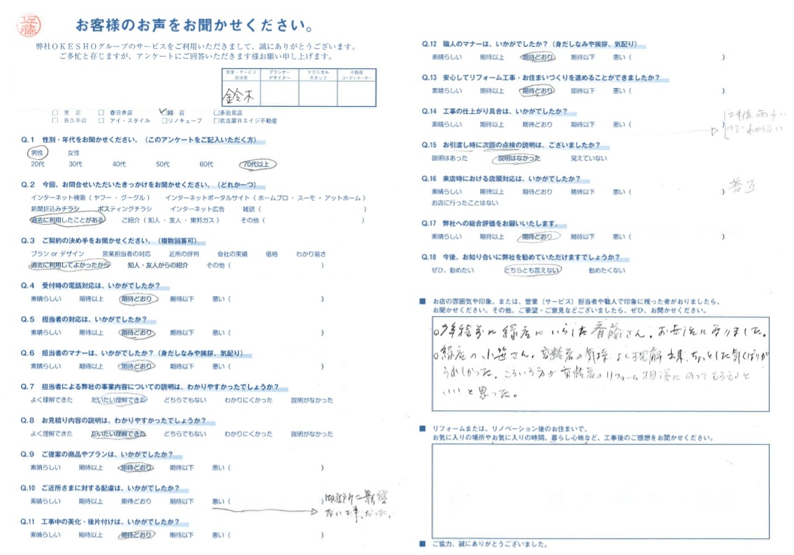 ○緑店の小笹さん。高齢者の気持 よく理解出来、ちょっとした気くばりがうれしかった。こういう方が 高齢者のリフォーム相談にのってもらえると いいと思った。
