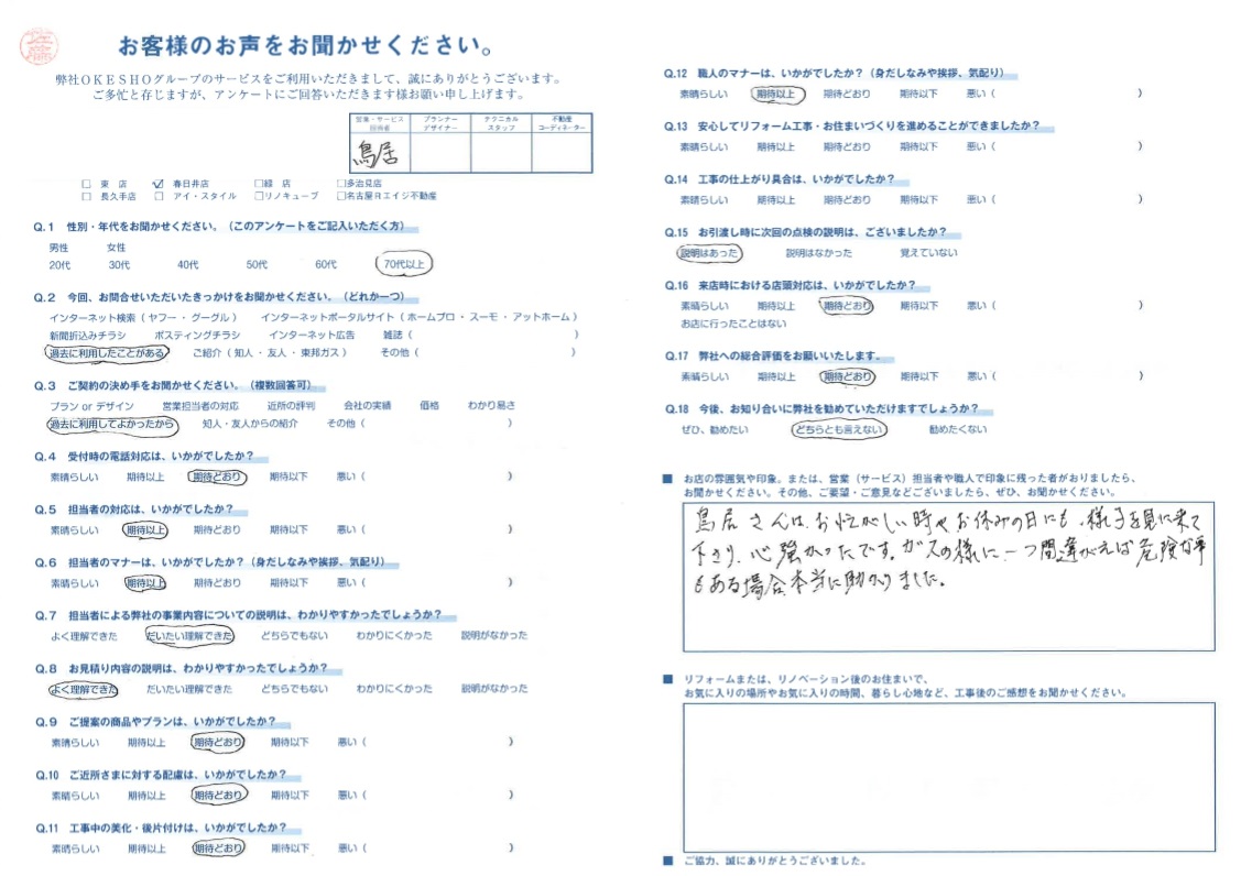 鳥居さんは、お忙しい時や お休みの日にも様子を見に来て下さり 心強かったです。ガスの様に一つ間違えば危険な事もある場合、本当に助かりました。