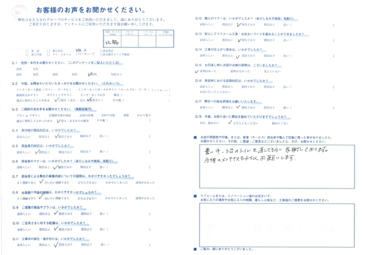 お店の雰囲気や印象。または、営業(サービス)担当者や職人で印象に残った者がおりましたら、お聞かせください。その他、ご要望・ご意見などございましたら、ぜひ、お聞かせください。