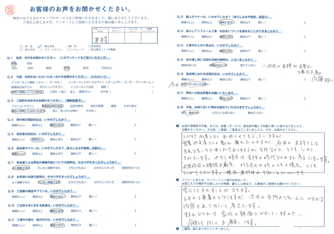 約束時間の確認や厳守、打ち合わせ時のメモの提示、とてもしっかりしています。現在進行中のリフォームについても 安心してまかすことができます。