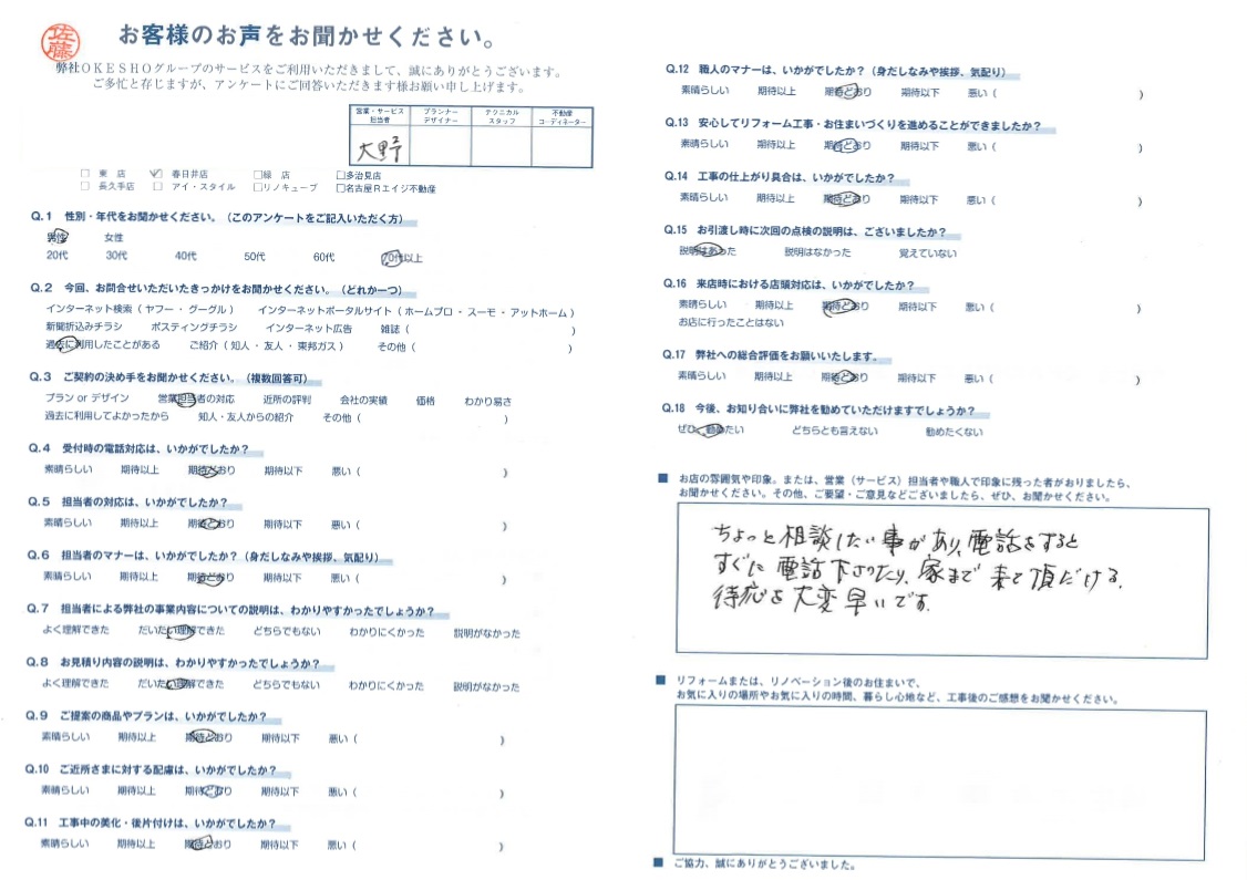 お店の雰囲気や印象。または、営業(サービス)担当者や職人で印象に残った者がおりましたら、お聞かせください。その他、ご要望・ご意見などございましたら、ぜひ、お聞かせください。