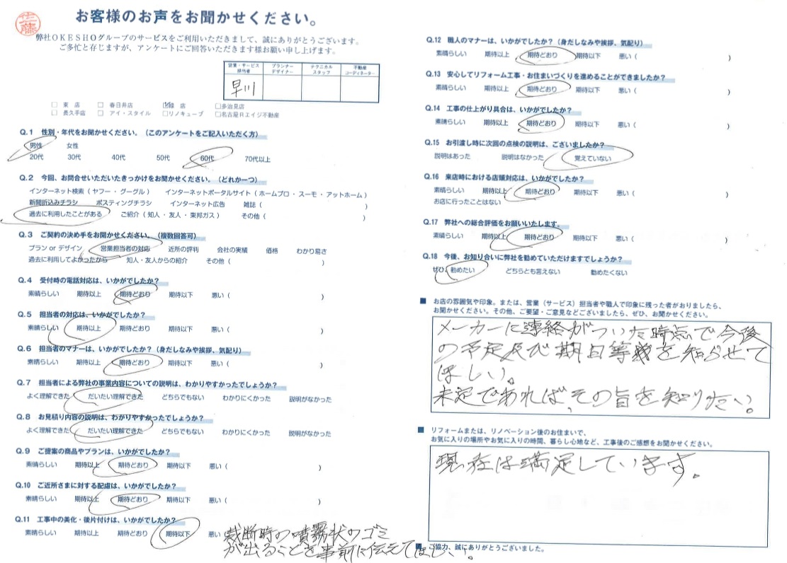 お店の雰囲気や印象。または、営業(サービス)担当者や職人で印象に残った者がおりましたら、お聞かせください。その他、ご要望・ご意見などございましたら、ぜひ、お聞かせください。