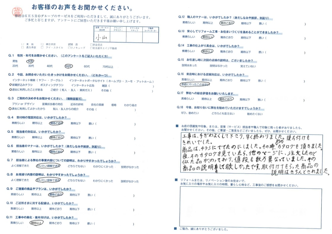 お店の雰囲気や印象。または、営業(サービス)担当者や職人で印象に残った者がおりましたら、お聞かせください。その他、ご要望・ご意見などございましたら、ぜひ、お聞かせください。
