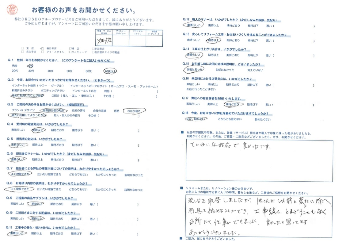 お店の雰囲気や印象。または、営業(サービス)担当者や職人で印象に残った者がおりましたら、お聞かせください。その他、ご要望・ご意見などございましたら、ぜひ、お聞かせください。