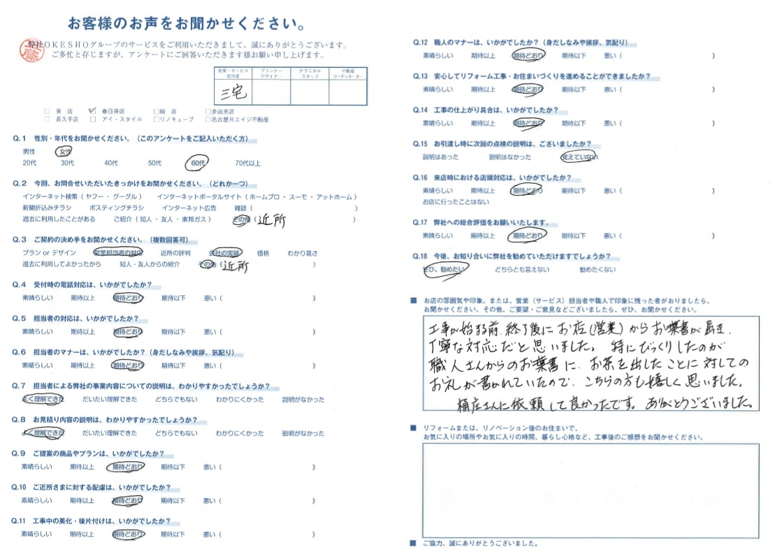 工事が始まる前、終了後に お店(営業)からお葉書が届き丁寧な対応だと思いました。特にびっくりしたのが 職人さんからのお葉書に お茶を出したことに対してのお礼が書かれていたので、こちらの方も嬉しく思いました。