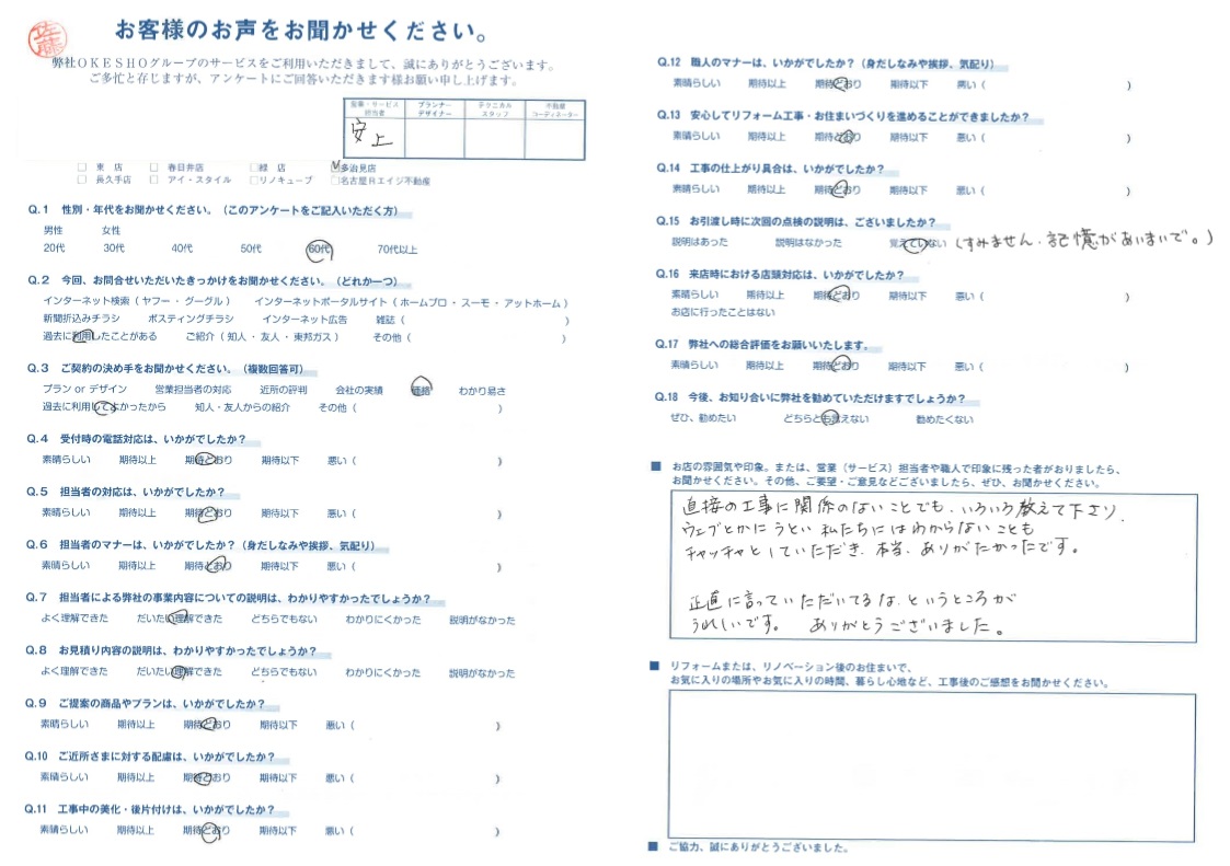 お店の雰囲気や印象。または、営業(サービス)担当者や職人で印象に残った者がおりましたら、お聞かせください。その他、ご要望・ご意見などございましたら、ぜひ、お聞かせください。