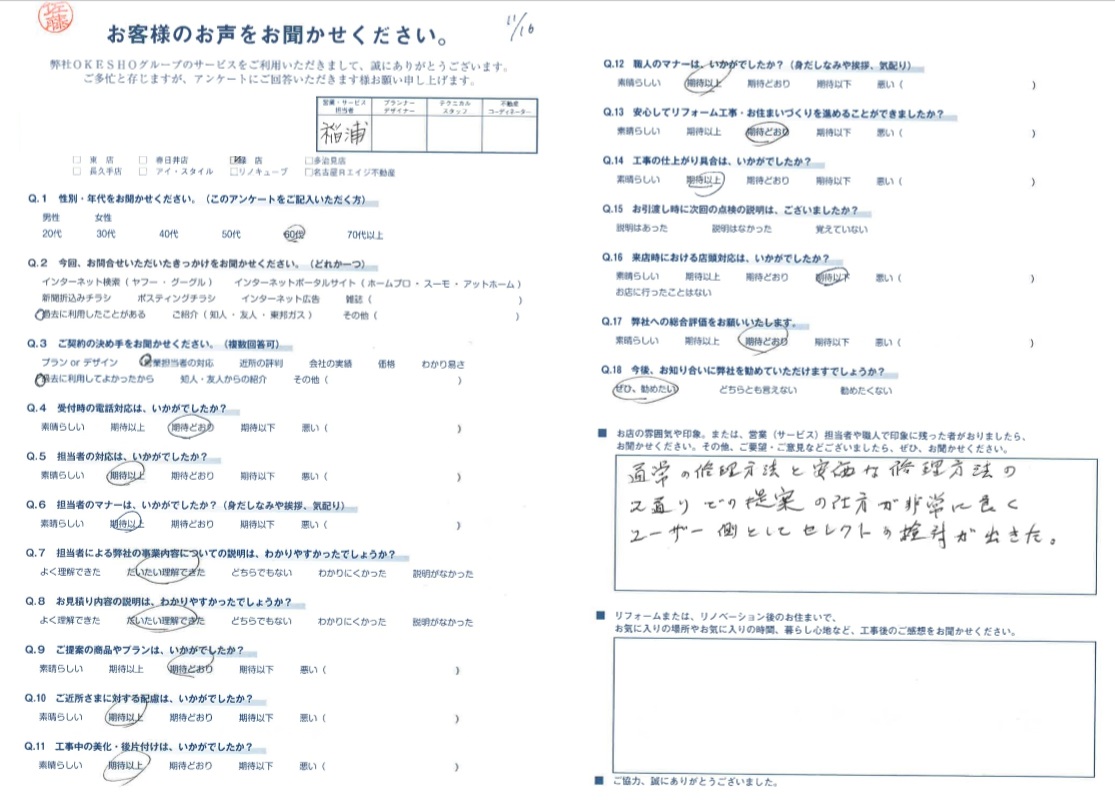 お店の雰囲気や印象。または、営業(サービス)担当者や職人で印象に残った者がおりましたら、お聞かせください。その他、ご要望・ご意見などございましたら、ぜひ、お聞かせください。