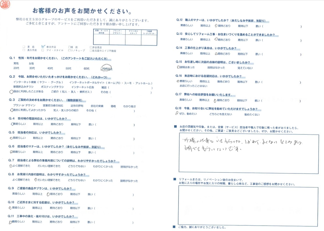 お店の雰囲気や印象。または、営業(サービス)担当者や職人で印象に残った者がおりましたら、お聞かせください。その他、ご要望・ご意見などございましたら、ぜひ、お聞かせください。
