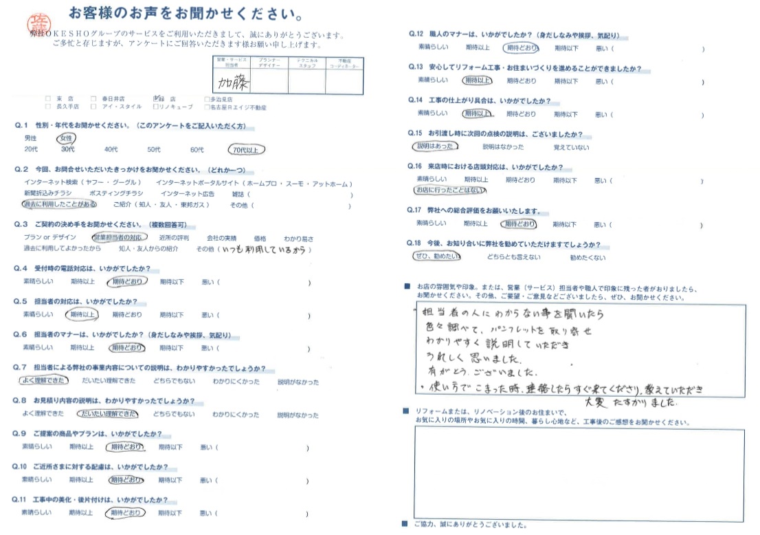 お店の雰囲気や印象。または、営業(サービス)担当者や職人で印象に残った者がおりましたら、お聞かせください。その他、ご要望・ご意見などございましたら、ぜひ、お聞かせください。