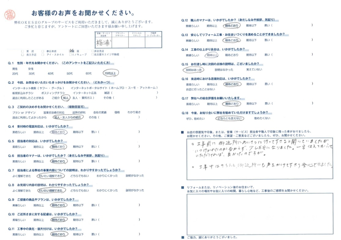 ○工事前に御近所にあいさつに行って下さると聞いていましたが、いつ行かれたのか分からず、少し不安になりました。一言伝えておいていただければ良かったのですが。