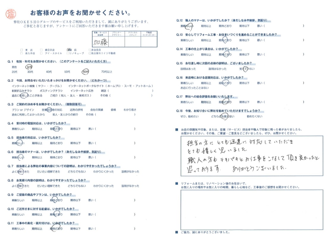 お店の雰囲気や印象。または、営業(サービス)担当者や職人で印象に残った者がおりましたら、お聞かせください。その他、ご要望・ご意見などございましたら、ぜひ、お聞かせください。