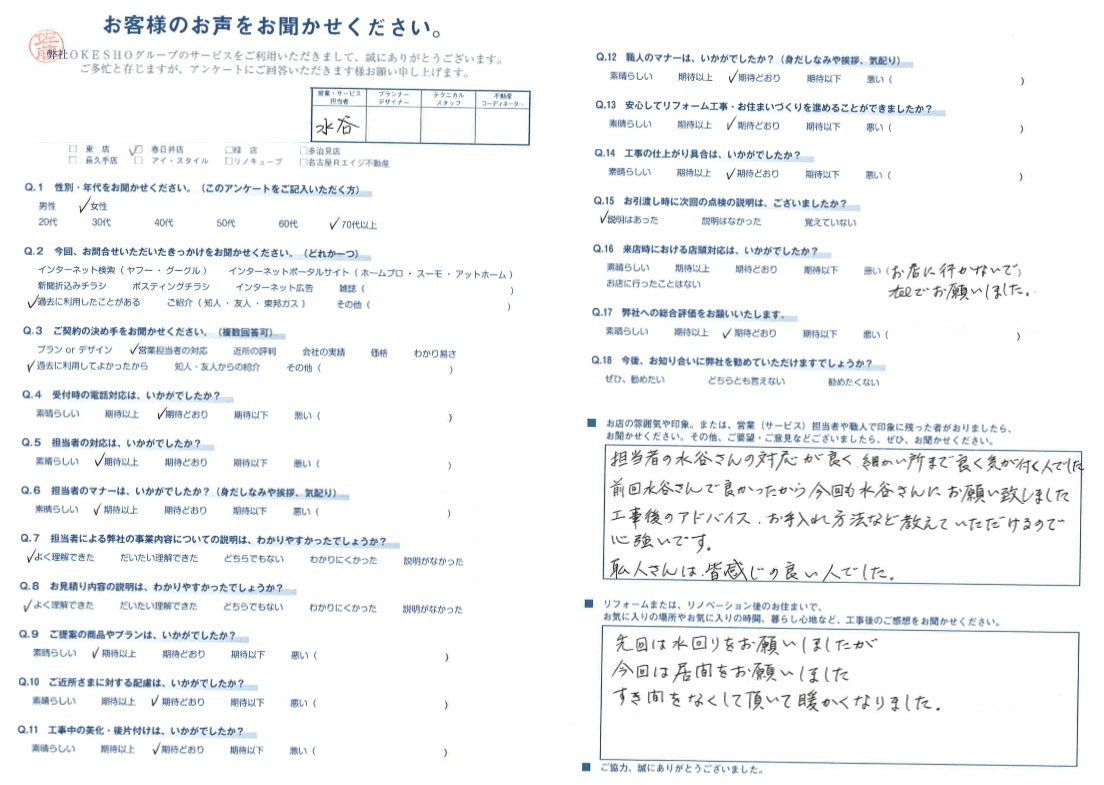 担当者の水谷さんの対応が良く、細かい所まで良く気が付く人でした。前回水谷さんで良かったから 今回も水谷さんにお願い致しました。工事後のアドバイス、お手入れ方法など教えていただけるので心強いです。