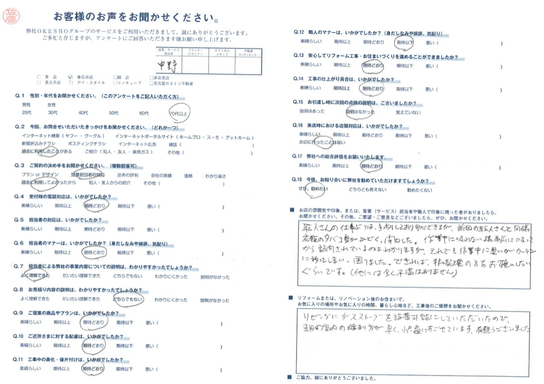 お店の雰囲気や印象。または、営業(サービス)担当者や職人で印象に残った者がおりましたら、お聞かせください。その他、ご要望・ご意見などございましたら、ぜひ、お聞かせください。