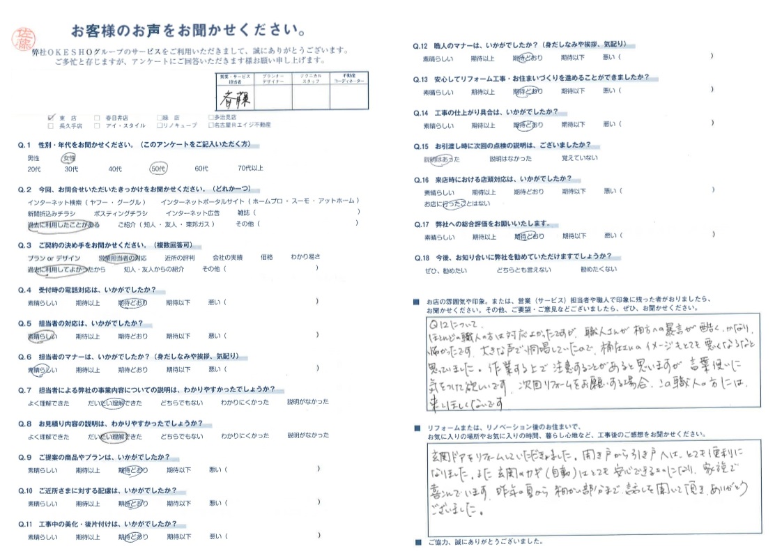 ほとんどの職人の方は対応よかったですが、職人さんが相方への暴言が酷く かなり怖かったです。大きな声で恫喝していたので、桶庄さんのイメージもとても悪くなるなと思っていました。作業する上で注意することがあると思いますが 言葉使いに気をつけて欲しいです。次回リフォームをお願いする場合、この職人の方には来てほしくないです。