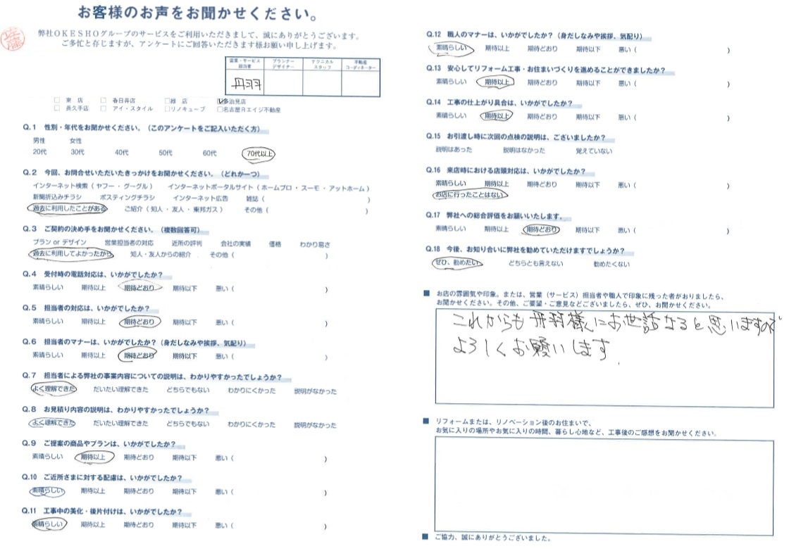 お店の雰囲気や印象。または、営業(サービス)担当者や職人で印象に残った者がおりましたら、お聞かせください。その他、ご要望・ご意見などございましたら、ぜひ、お聞かせください。