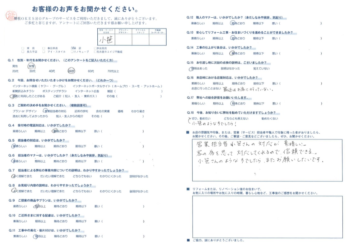 営業担当者 小笹さんの対応が素晴しい。客の為を思って対応してくれるので、、信頼できる。小笹さんのような方でしたらまたお願いしたいです。