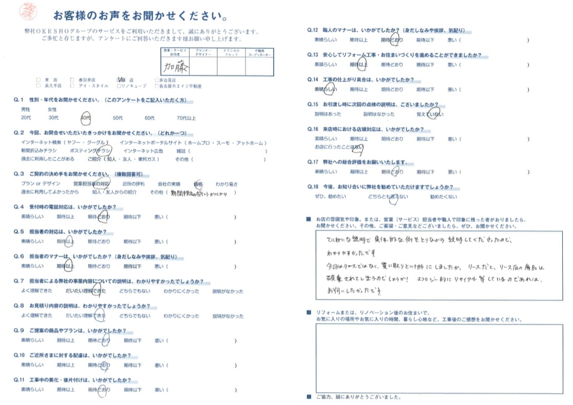 お店の雰囲気や印象。または、営業(サービス)担当者や職人で印象に残った者がおりましたら、お聞かせください。その他、ご要望・ご意見などございましたら、ぜひ、お聞かせください。
