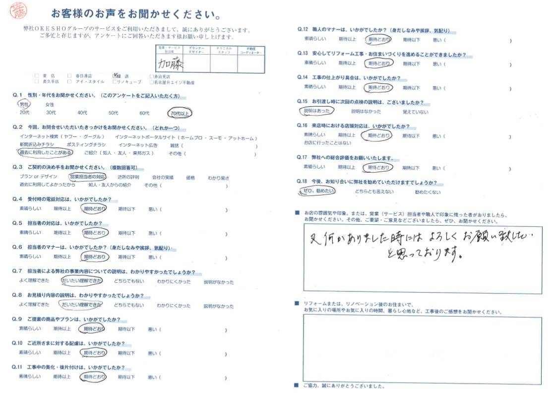 お店の雰囲気や印象。または、営業(サービス)担当者や職人で印象に残った者がおりましたら、お聞かせください。その他、ご要望・ご意見などございましたら、ぜひ、お聞かせください。