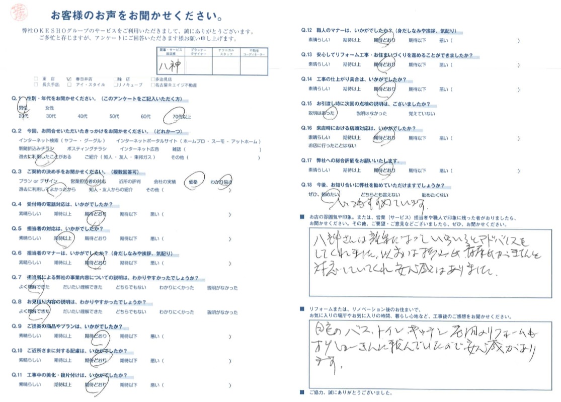 お店の雰囲気や印象。または、営業(サービス)担当者や職人で印象に残った者がおりましたら、お聞かせください。その他、ご要望・ご意見などございましたら、ぜひ、お聞かせください。
