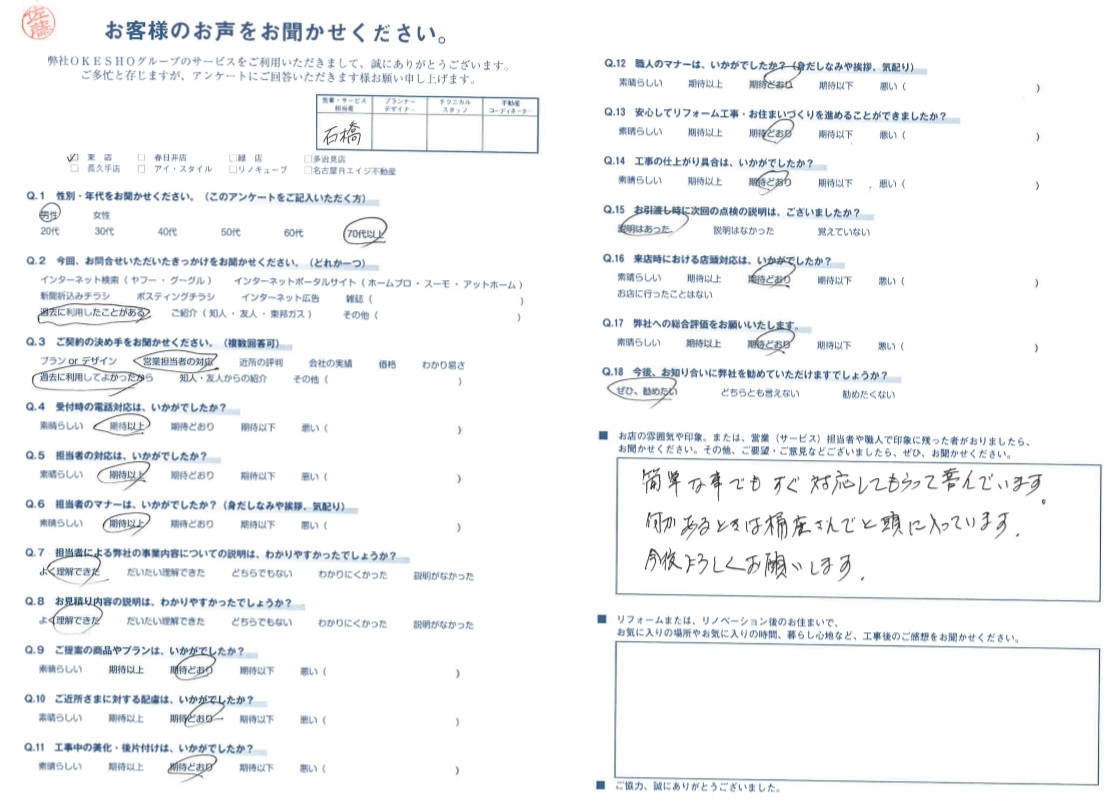 お店の雰囲気や印象。または、営業(サービス)担当者や職人で印象に残った者がおりましたら、お聞かせください。その他、ご要望・ご意見などございましたら、ぜひ、お聞かせください。